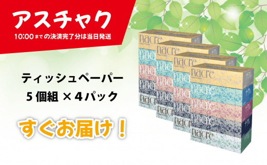 全国初!!必要な時にすぐ届く! 明日届く返礼品!!\\すぐお届け//ナクレ ティッシュペーパー 5箱4セット 計20箱 アスチャク 対象品 日用品 常備品 備蓄品 box ちり紙 ティシュー ボックスティッシュ パルプ100% 無香料 1箱 400枚 東北産 製造元北上市 三菱製紙