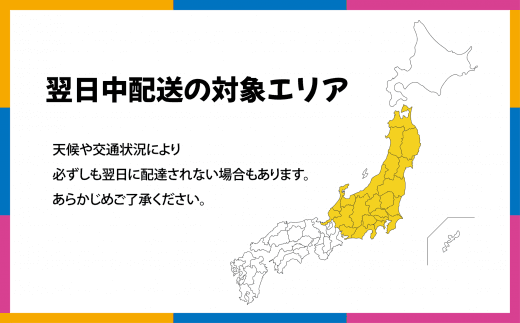 ※翌日中に返礼品をお届け可能なエリアは、・青森、岩手、秋田、宮城、福島、茨城、栃木、群馬、埼玉、東京、神奈川、千葉、山梨、静岡、長野、新潟、富山、石川、福井、岐阜、愛知、三重になります。
