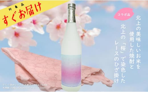 北上産のひとめぼれを使用した米焼酎をさくら染めのレースひざ掛けで可愛くラッピング!