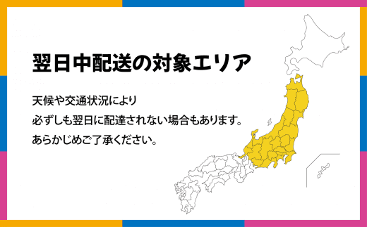 ※翌日中に返礼品をお届け可能なエリアは、・青森、岩手、秋田、宮城、福島、茨城、栃木、群馬、埼玉、東京、神奈川、千葉、山梨、静岡、長野、新潟、富山、石川、福井、岐阜、愛知、三重になります。