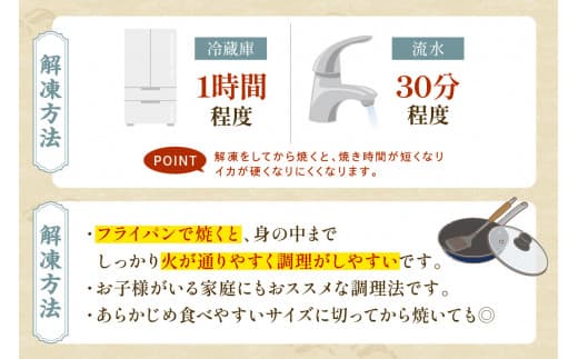 冷蔵庫で1時間程度、または流水で30分程度の解凍をしてから焼くと、焼き時間が短くなりイカが硬くなりにくくなります。