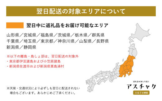 ・翌日中に返礼品をお届け可能なエリアは、山形県、宮城県、福島県、茨城県、栃木県、群馬県、千葉県、埼玉県、東京都、神奈川県、山梨県、長野県、新潟県、静岡県の1都13県のエリアになります