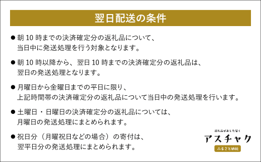 ・月曜から金曜までの平日に限り、上記時間帯の決済確定分の返礼品について当日中の発送処理を行います。